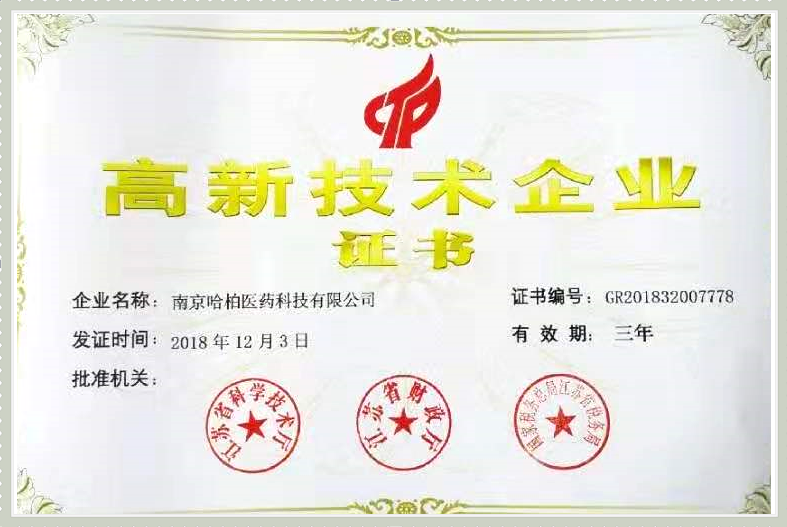 祝賀南京哈柏醫(yī)藥科技有限公司,榮獲(國家高新技術(shù)企業(yè))證書。