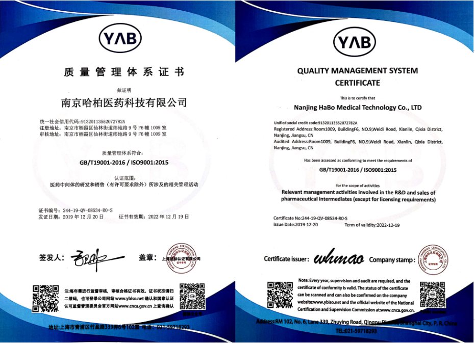熱烈慶祝哈柏醫(yī)藥順利通過新版質(zhì)量管理體系認證,獲得iso9001 2015版證書,哈柏醫(yī)藥將持續(xù)保持并更新內(nèi)部質(zhì)量管理體系。
